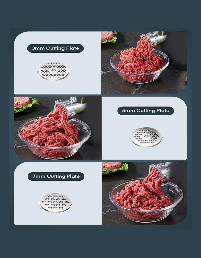 Constructed from durable stainless steel, this home-use meat grinder features a powerful 2200W ball bearing copper motor with built-in overheat protection. Compactly sized at 21x20x31 cm and weighing 5 kg, it delivers reliable performance and safety for efficient meat processing.